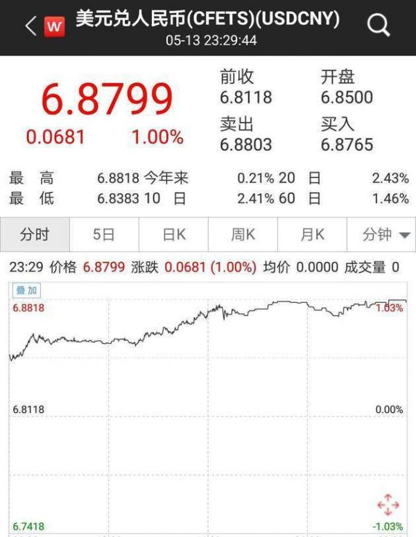@每日经济新闻【在岸人民币盘中跌破6.88,离岸已破6.91】北京时间5月13日周一,人民币兑美元汇率延续跌势,在岸和离岸人民币盘中双双创逾六个月新低。