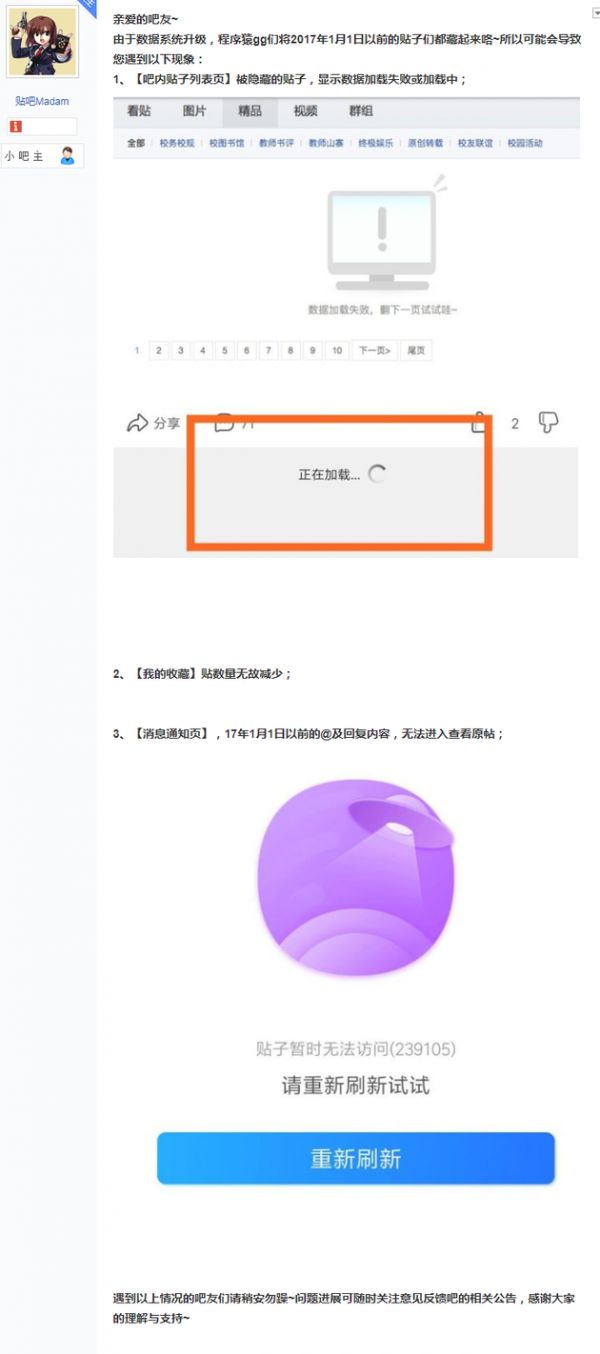 @新浪科技【百度贴吧开始系统维护,2017年前的内容暂时无法访问】百度贴吧昨日发布维护公告,因系统维护历史数据,2017年1月1日以前的贴子暂时无法访问,修复时间另行通知。届时在访问贴吧时可能遇到数据加载失败或者加载中,以及帖子数量减少的现象,在查看回帖内容时也可能会报错。