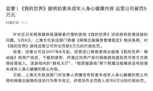 @快科技【网游《我的世界》涉低俗违规内容,运营公司被罚5万元】5月13日消息,据扫黄打非办官方微信公众号消息,针对近日央视等媒体报道网易代理的游戏《我的世界》涉低俗和色情违规的问题,5月6日,上海文化执法部门依据《网络出版服务管理规定》相关条例,对《我的世界》游戏运营公司作出罚款5万元的行政处罚。
