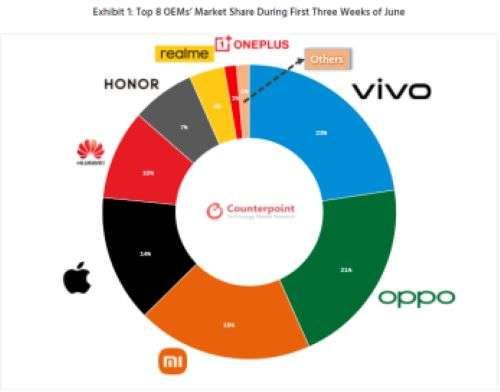 这增势同样延续到了二季度。7月1日,知名数据调研公司Counterpoint的数据显示,在6月前三周的销量中排名第一的是vivo,占比23%。其次是oppo、小米、苹果、华为等品牌。