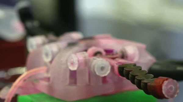 最终结果,就是上图展示的这款3D 打印三指柔软机械手。通过响应气压的变化,它可以轻松实现每个手指的单独移动。