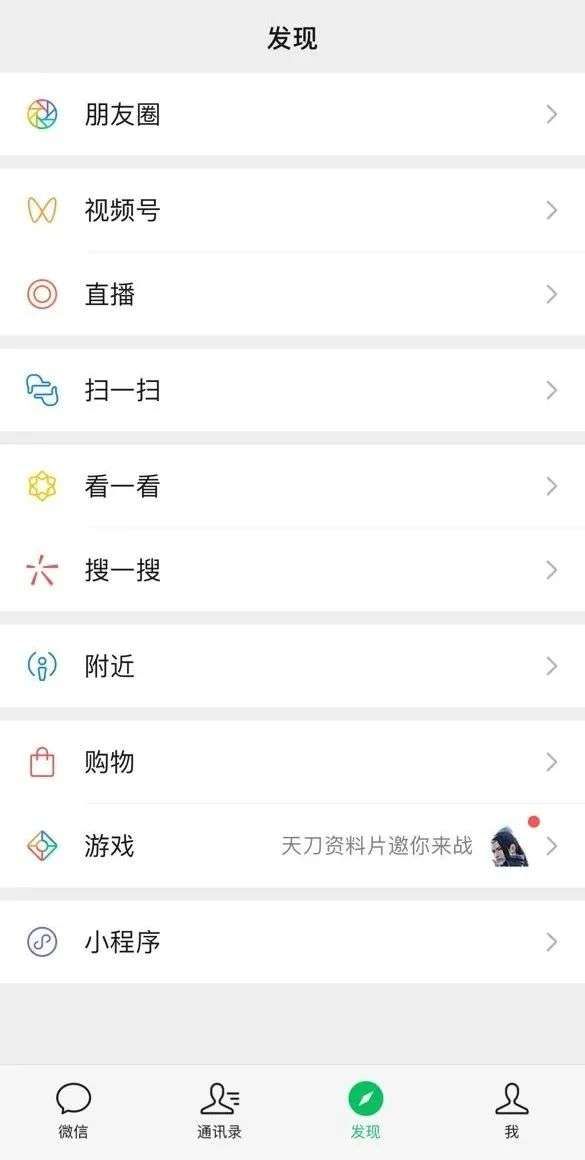腾讯游戏在微信的“发现”页面拥有一个二级入口,即微信游戏中心。这个入口的位置在小程序之上,购物之下,吸引眼球的能力比较强,但是谈不上最强——至少不会比朋友圈、视频号和直播更强。