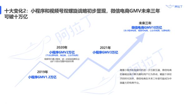 2021年上半年,小程序进一步放开了外部跳转,形成以社交分享为核心、向“泛生态”扩散的流量链路,小程序“通行万物”的时代已经到来。据阿拉丁研究院测算,未来三年,小程序和视频号双螺旋战略将促进微信电商GMV飞速提升,整体有望突破10万亿,成为中国最大的电商平台。