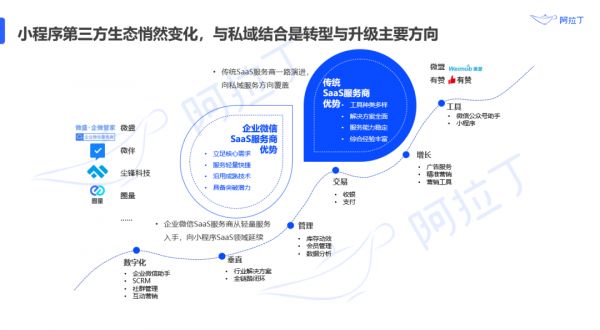 小程序与企业微信的进一步连接,为企业品牌私域建设提供了更多实践机会,进一步释放私域营销想象空间。第三方SaaS服务商积极适应生态发展,开启新一轮服务升级。以微盟、有赞为代表的传统SaaS服务商2021年先后推出企业微信助手,并且与小程序服务打通,拓展服务范围和服务深度。同时,以微盛、微伴、尘锋科技、圈量为代表的新型SaaS服务商聚焦企业微信服务这一核心需求,向小程序服务方向扩散与创新。阿拉丁研究院认为,传统服务商与新型服务商的产品和技术优势不同,服务重心也有差异,企业品牌可以依据自身特点和需求,选择适合的方式快速进入市场。