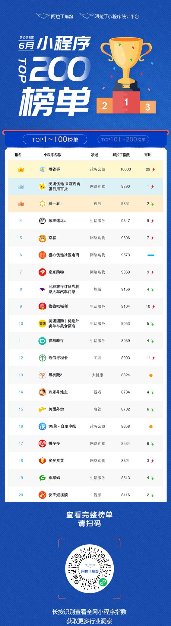 图:2021年6月小程序阿拉丁指数TOP200榜单之1-20