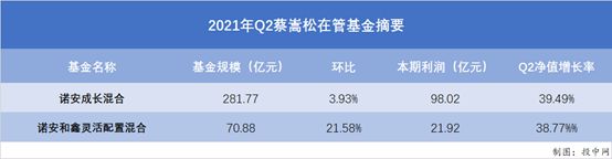 根据季报,2021年二季度诺安成长管理规模为281.77亿元,较一季度的271.11亿元环比增长3.93%,基金份额净值增幅高达39.49%;诺安和鑫管理规模为70.88亿元,较一季度的58.30亿元环比增长21.58%,净值增长率为38.77%。截至2021年6月30日,蔡嵩松管理的两只基金期末总规模为352.65亿元,相比2021年Q1的329.4亿元增长7%。