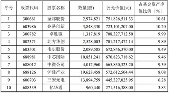 此外,该基金还在二季度增持了兆易创新、卓胜微、中芯国际、中微公司、沪硅产业和三安光电,被减持的则有北方华创、韦尔股份。