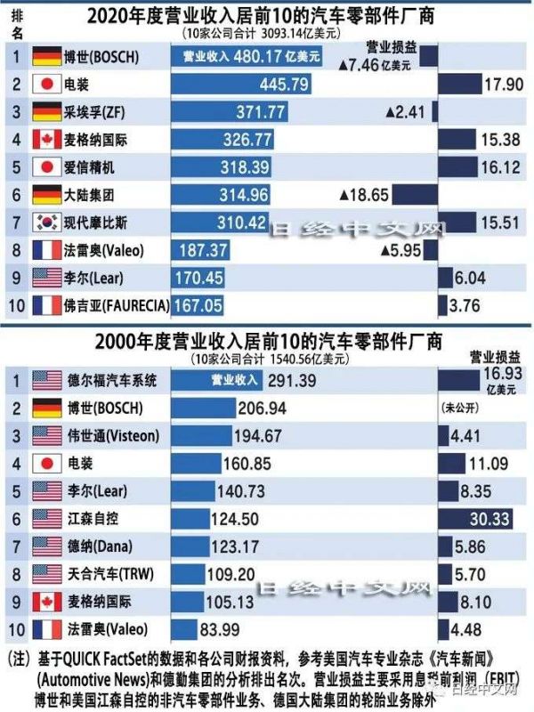 日本经济新闻(中文版:日经中文网)根据QUICK FactSet的数据等分析了全球排名前10的汽车零部件厂商的营业收入。将最近的2020年度与欧洲、日本等全面启动尾气排放规定的2000年度进行了比较。