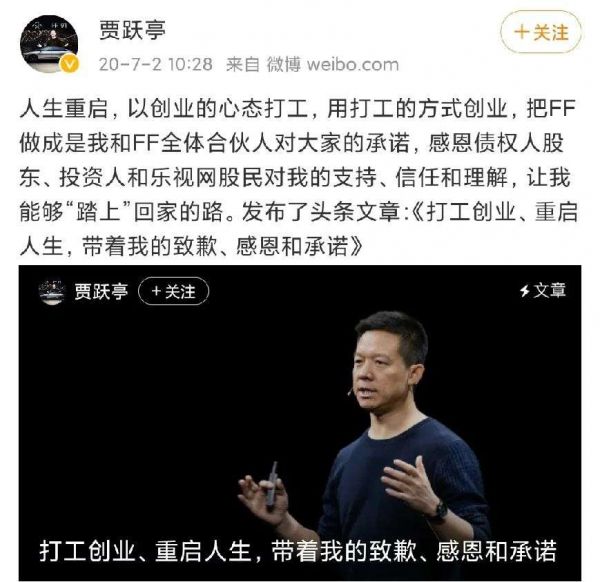 2019年10月,贾跃亭为了还债,不得不在美国申请个人破产。九个月后,伴随着一篇名为《打工创业、重启人生,带着我的致歉、感恩和承诺》的文章出现在其个人微博中,他的个人破产重组终于完成。