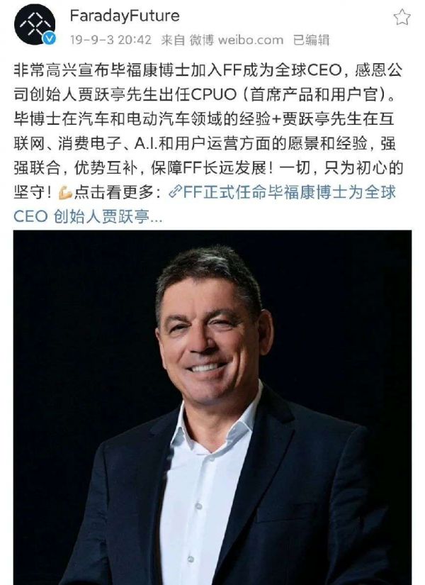 今年3月底,FF官微发布消息表示,已聘请陈雪峰先生出任FF中国区CEO,之后向毕福康直接汇报。据FF介绍,陈雪峰先后在宗申汽车、长安福特马自达、福特、奇瑞捷豹路虎工作,在其加盟后,将助力FF91尽快量产、推动FF中美双主场战略的全面落地。