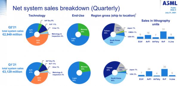 光刻机预定值方面,二季度达到了82.7亿欧元,创下历史记录,总订单积压值达到了175亿欧元;总的光刻机预定量达到167台,其中多数是EUV。
