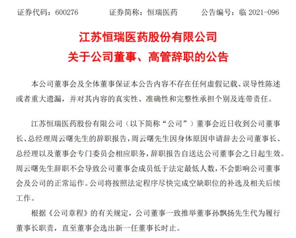 恒瑞医药公告称,公司董事长、总经理周云曙因身体原因申请辞职,公司董事一致推举董事孙飘扬代为履行董事长职责,直至董事会选出新一任董事长为止。
