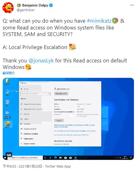 在这一漏洞披露之后,引发不少研究人员的关注,其中@Benjamin Delpy 还进行了一波演示验证证实了该漏洞的存在: