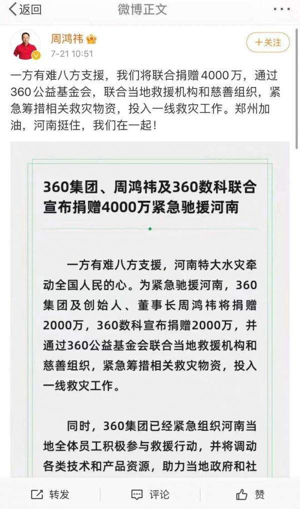 7月21日,周鸿祎在微博中提到,360集团将通过360公益基金会,联合当地救援机构慈善组织捐赠4000万元,紧急筹措相关救灾物资,投入一线救灾工作。