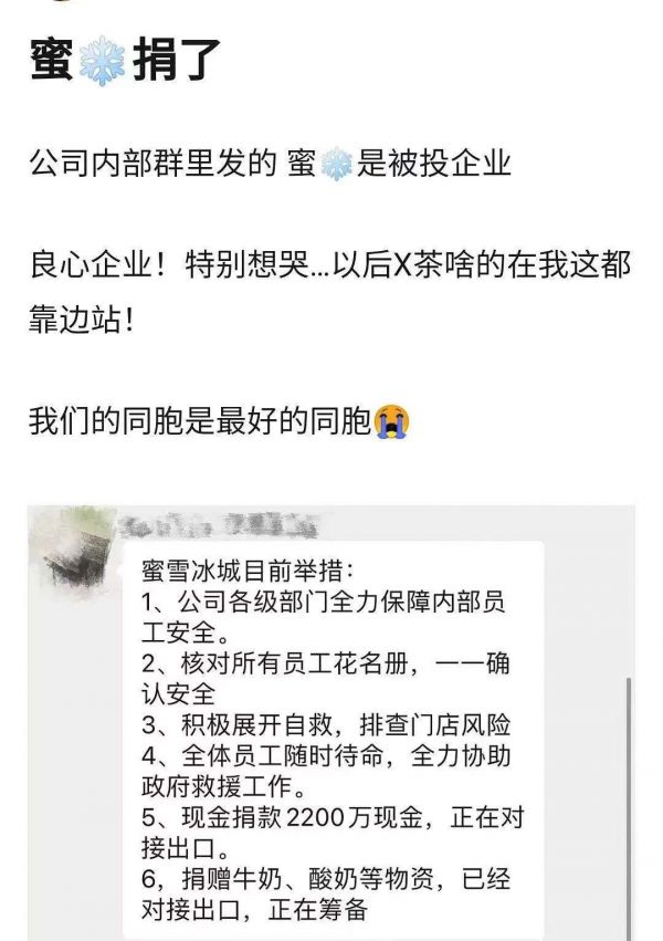 身处在受灾区的蜜雪冰城,依然坚持投身公益。据蜜雪冰城内部群的消息,公司现金捐款2200万元,正在对接出口,此外,捐赠牛奶、酸奶等物质已经对接出口。