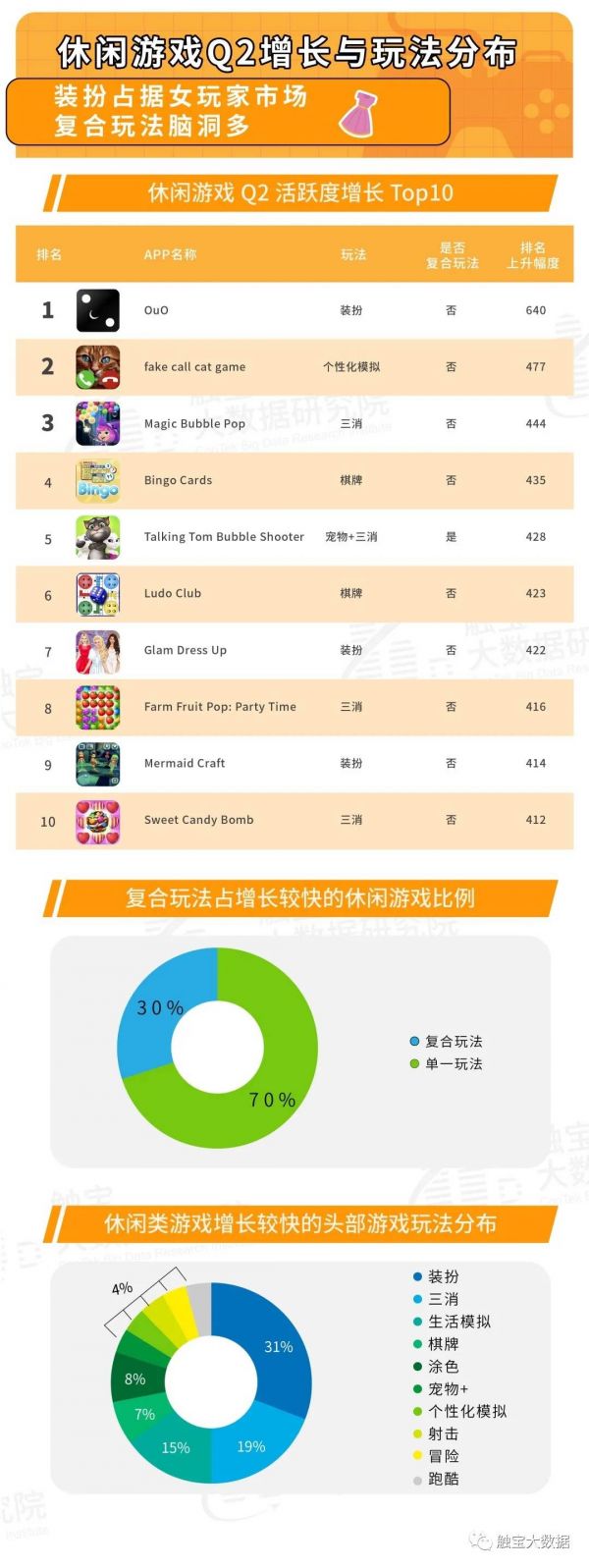 休闲游戏的玩法随着用户分层而出现多种新类型玩法,在快速获客的超休闲游戏之外,不同地区的休闲游戏也在不断进化,相比之下原有的玩法同质化较多出圈概率较小,很多游戏在探索复合性玩法,延长用户的生命周期,提升付费意愿与广告的展示效果。在区域方面,欧美地区仍然是迭代最快,玩法最多元化的地区,适合新玩法的迭代。触宝大数据研究院根据本年度以来的增长状况和玩法变化梳理上半年发展状况,为下半年趋势提供参考。