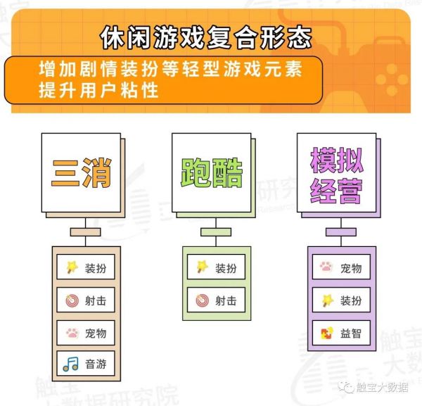 各地随着市场发展都开拓出了更加复合型的玩法分层次吸引受众,其中装扮,经营等最容易与需要重复性操作的射击、消除等玩法进行结合,大部分成功爆款都与三消类玩法进行组合。