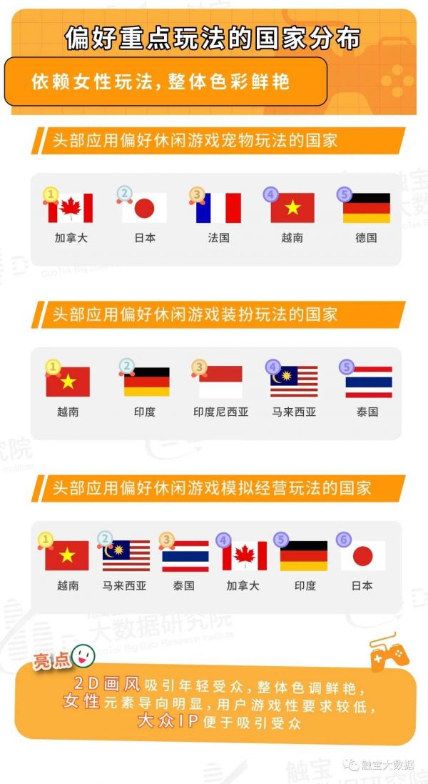 各国之间对玩法也有所偏爱,因此这类国家在重点玩法中也会有所偏好,从头部游戏中各种玩法的占比来看,宠物模拟玩法在发达市场较为通行,这类玩法中很容易与著名卡通IP融合,出现爆款, 2D卡通仍然是移动游戏中最受欢迎的艺术风格,这类风格也吸引了年轻用户。装扮类玩法则很明显的出现了东南亚偏好的倾向,因为当地休闲类游戏的女用户占绝对优势,当地也会在游戏中添加部分更吸引与女性用户的元素。可以说,2D卡通及相关IP以及女性偏好的鲜艳色彩,易上手以及陪伴感的元素都引起女性的兴趣。