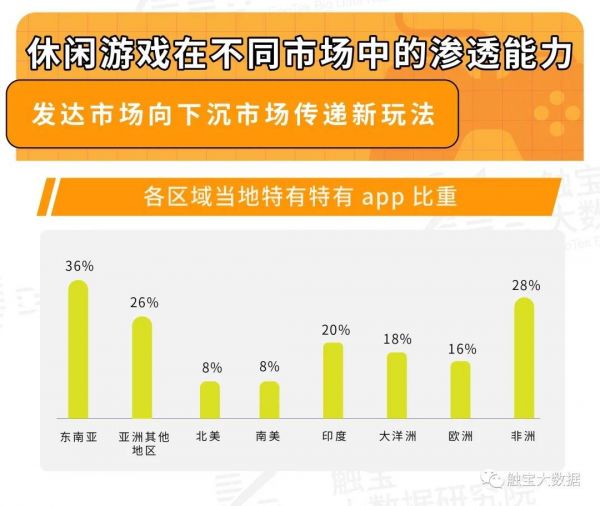 触宝大数据统计了各地区头部休闲类游戏中当地独有的游戏比例,发现欧美地区比例最低,只有8%-16%。即美洲与欧洲审美与全球最为通行,当地的官方语言与游戏习惯由于文化输出世界其他地区也较为熟悉。习惯已经下沉到了其他地区,当地引领了游戏玩法的趋势潮流。当地的用户对新玩法和复合玩法的评价也会更高,可以更快速的迭代出合适版本。相比之下,非洲地区与东南亚地区的游戏有较多地域特征,他们的习惯与发达市场接轨较慢,也更容易受本土硬件和运营商的影响。