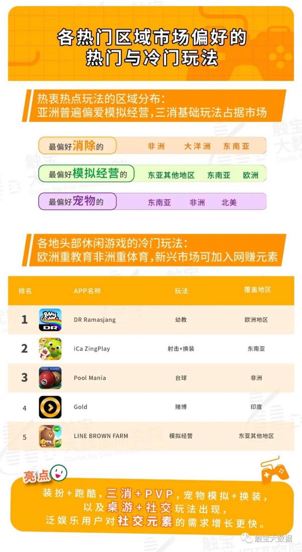 地区的分布来看,亚洲地区普遍偏爱模拟经营类应用,欧美地区对多种复合社交类玩法都有很大的兴趣,新玩法可率先在当地推广,而在非洲地区目前还是以简单三消和基础宠物类玩法为主。