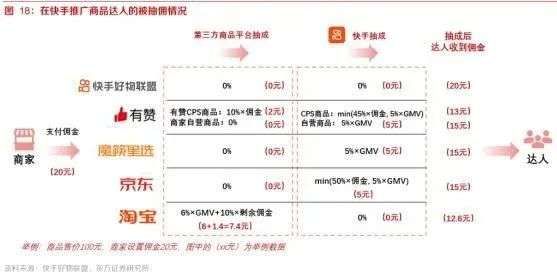 以快手的推广类商品为例,若通过快手好物联盟(自建商品供应链)推广的商品,相比第三方平台模式,主播到手的佣金是最多的。