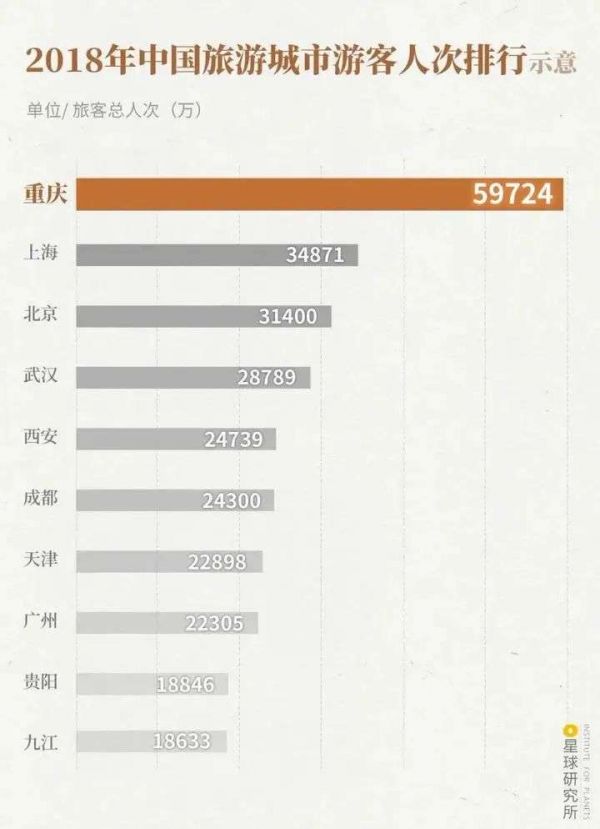 重庆盘踞网红城市排行榜前三的位置已经好几年了,早在2018年,重庆的游客人次就达到了5.9亿,甩出第二名上海2.5亿。