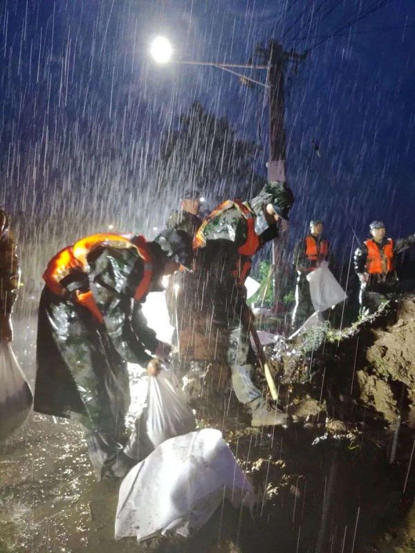 7月21日,驻扎在开封地区的空降兵某旅官兵冒雨在贾鲁河祥符区段加固堤坝丨新华社发(李志伟 摄)