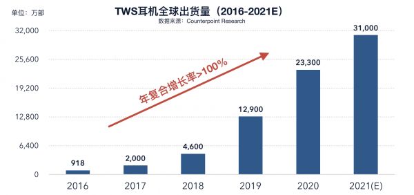 如今的TWS耳机市场已经杀成了一片红海,各路厂商争相进军。根据研究机构Counterpoint数据,2016年,全球TWS耳机销量仅为918万台,而到了2020年,这一数字飙升到了2.33亿台,市场年复合增长率超过100%。