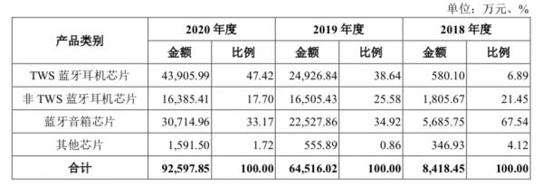 中科蓝讯2018年收入仅有6.89%来自TWS蓝牙耳机,图片来源:中科蓝讯招股书