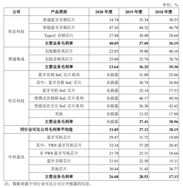 中科蓝讯产品毛利率对比,图片来源:中科蓝讯招股书