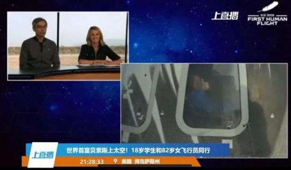 20日晚21点23分,伴随着巨大的烟尘消散,银色子弹头式的载人舱缓缓打开舱门,世界首富、亚马逊创始人贝索斯的“飞上天和太阳肩并肩的”梦想实现了。更早几天之前,维珍银河创始人理查德·布兰森抢走了贝索斯“太空旅游第一人”的称号。