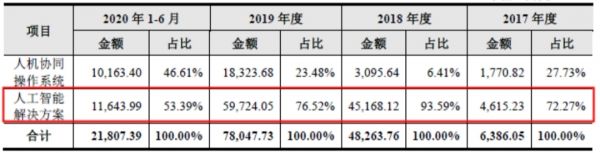 招股书披露,云从科技的主营业务是向企业和政府出售“人工智能解决方案”和“人机协同操作系统”,前者是软硬件一体、后者则是软件系统。其中“人工智能解决方案”是云从的核心收入来源,2019年此板块营收逾5亿元,占整体营收超过七成,2020上半年这一比例降低到53.39%。