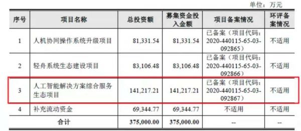 据悉,云从科技此次IPO预计融资规模为37.50亿元,募集资金所得净额将全部围绕其人工智能技术的研发展开,包括人机协同操作系统升级项目、轻舟系统生态建设项目、人工智能解决方案综合服务生态项目、补充流动资金。其中,人工智能解决方案综合服务生态项目预计投入金额最多逾14亿,约占此次预计募集资金总额的37.66%。