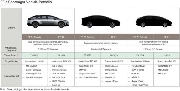 FF在招股书里说,FF81系列将是一款高端大众市场电动车,和特斯拉Model S和Model X、蔚来ES8正面刚;FF71系列是FF的大众市场乘用车,与特斯拉Model 3和Model Y硬碰硬。