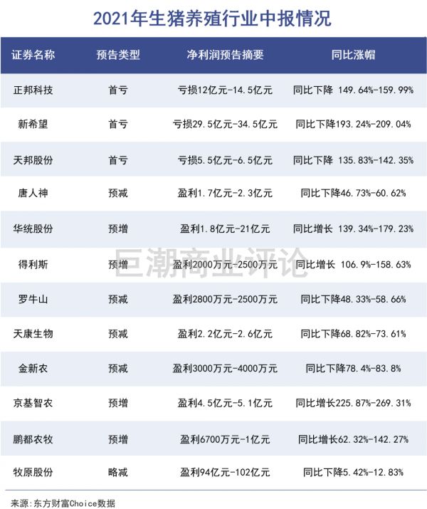 唐人神、罗牛山等生猪养殖企业,虽然有不同程度的盈利数据,但同比2020年也大多出现了巨幅下滑。