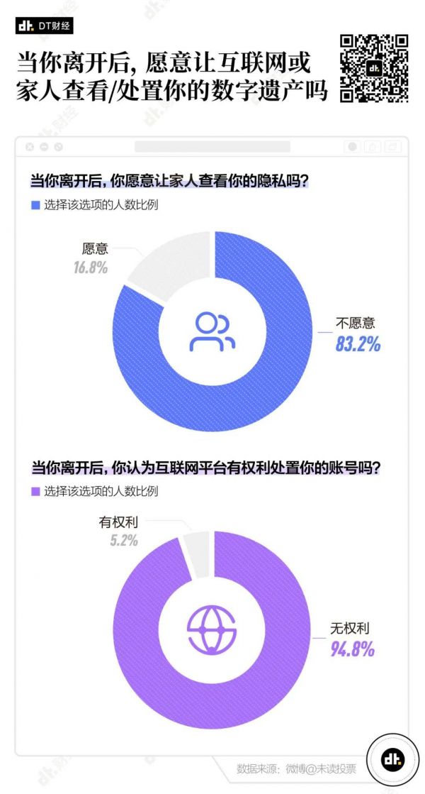 尽管人们在注册大部分APP时,勾选“我同意”的用户协议已经明确规定了用户对账号只具有使用权,所有数据记录最终归运营商所有。但在微博用户 @未读 去年就“网络遗产”话题发起的投票中,超过9成的人认为,互联网没有权利处置自己的账号;还有83.2%的人,并不希望家人查看自己的隐私。