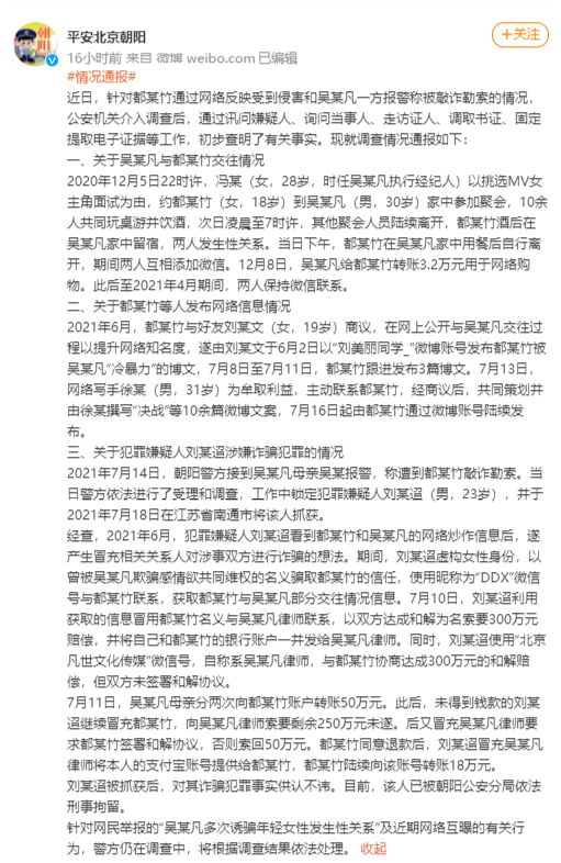 7 月22日晚20:00,北京市公安局发布了吴亦凡都美竹事件的调查结果。