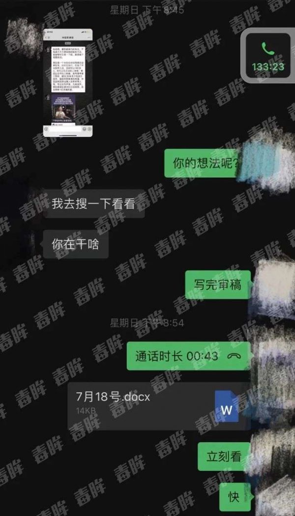 她跟我说大概的方向和内容,我从她那里搜集信息和线索,比如说跟吴亦凡怎么见面,中间过程什么样子,包括把吴亦凡的经纪人毛可异的一些聊天录屏发给我,结合这些再去写博文。