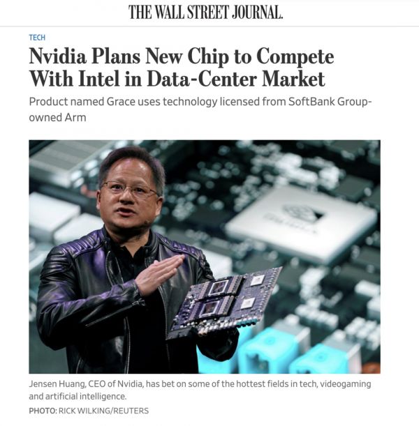 黄仁勋带领的英伟达也在眼馋英特尔数据中心的业务,推出服务这一市场的芯片。去年,英伟达已超越英特尔成为全球市值最高的芯片公司。