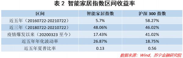 以近五年的维度去看,智能家居指数涨幅极小,大幅度低于沪深300指数,且波动率高,夏普比率低,表现都弱于沪深300指数。