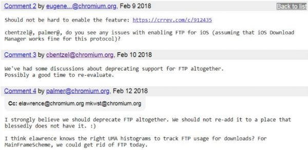 谷歌的开发人员也一直想要在 Chrome 浏览器中停止对 FTP 的支持,其中还有一位 Chrome 开发人员在 2014 年创建了一个 Chrome 错误报告,供开发者在其中讨论有关浏览器支持 FTP 的弊端。