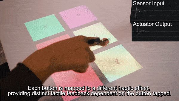 也就是说,摄像头识别到手指与平面接触时产生的震动强度,会影响你与AR界面的交互体验。Tactile Echoes产生的体感和音频反馈与手指接触表面的力度相关,用力越大反馈越强烈,当你轻触某样物体时,可能会听到轻轻的回声,当你用力捅某样东西时,可能会听到砰的回声。而当你的手指触碰不同的界面时,得到的反馈也有所不同。
