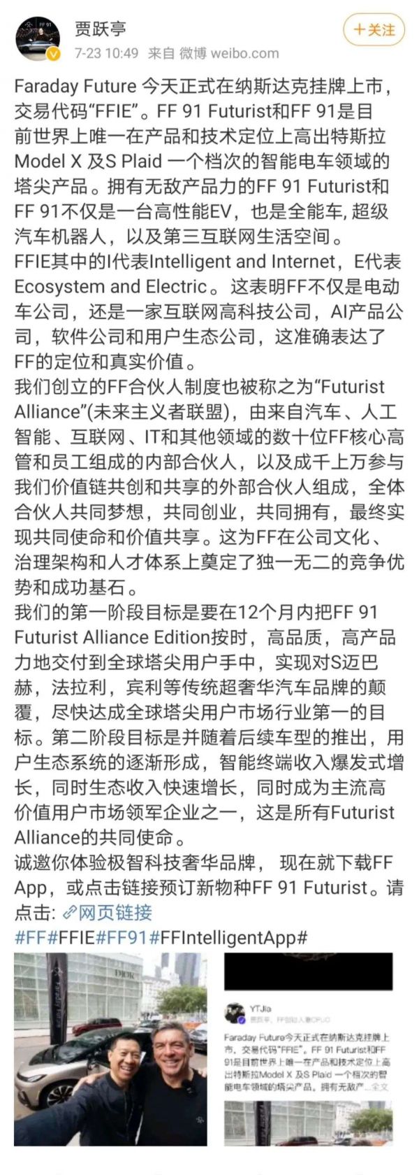 7月22日,FF在纳斯达克敲钟之时,作为创始人的贾跃亭和现任CEO毕福康一起站在台下。