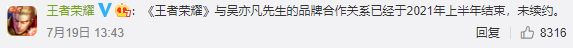 《王者荣耀》官方微博在其举办的全国赛事微博下直接表明了态度,《王者荣耀》将与吴亦凡停止品牌合作关系,也并未续约,同时和吴亦凡解约的还有腾讯旗下的腾讯视频。