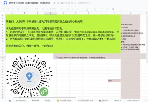 连接了更多平台,也是这次“文档救助”的亮点,文档不再是单纯的表格,而是连接了多个平台的小小生态。为了能够满足前方救援信息及时传递的需求,许多网友将建立的微信群、地图小程序二维码等附到表格中,所有人可以通过表格快速定位到所需的群组中。