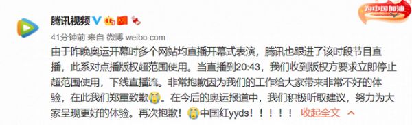 7月24日消息,腾讯视频今日在其官方微博回应昨日东京奥运会转播故障称,“由于昨晚奥运开幕时多个网站均直播开幕式表演,腾讯也跟进了该时段节目直播,此系对点播版权超范围使用。当直播到20:43,我们收到版权方要求立即停止超范围使用,下线直播流。非常抱歉因为我们的工作给大家带来非常不好的体验,在此我们郑重致歉。”