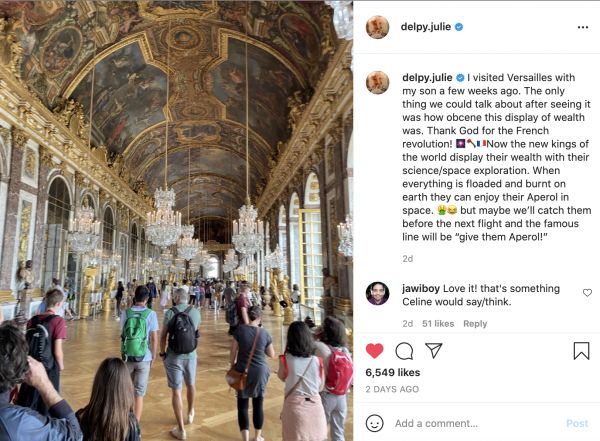主演“爱在三部曲”电影系列的法国女星朱莉·德尔佩在Instagram上发帖表示,自己在参观凡尔赛宫的时候曾感到强烈的不适,被金碧辉煌的宫殿里贵族富豪的财富展示恶心到了,而当今世界的富人霸主们则开始用“太空探索”来展示他们的财富了,在这地球其他角落仍然处境艰难的时候,他们却在享受太空里的鸡尾酒呢。