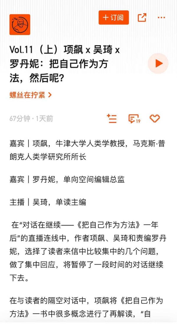 不知道大家是否还记得去年36氪编辑部推荐书单里的《把自己作为方法》,本期要推荐的播客便可以看做是这本书的续集——项飙老师做客吴琦的播客“螺丝在拧紧”,与吴琦、编辑罗丹妮再次对谈。