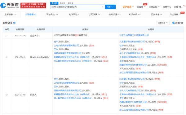 天眼查App显示,7月19日,北京乐华圆娱文化传播有限公司发生工商变更,字节跳动关联公司北京量子跃动科技有限公司、浙江东阳阿里巴巴影业有限公司、华人文化有限责任公司等成为乐华娱乐的新股东。