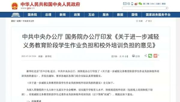 被张坤躲过的这次教育股价大跌,源于近期网 传新一轮、更为严格的教育领域监管政策即将施行。2021年7月24日,新华社报道,中办、国办印发了《关于进一步减轻义务教育阶段学生作业负担和校外培训负担的意见》,“双减”政策正式向社会公开。(以下简称意见)